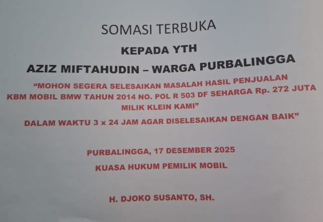 Somasi tertanggal 17 Desember 2025 tersebut dilayangkan oleh kuasa hukum Bambang Irawan, H. Djoko Susanto, SH, kepada Aziz M, warga Purbalingga. Dalam surat somasi itu, pihak yang bersangkutan diberi waktu 3 x 24 jam untuk menyelesaikan kewajiban pembayaran secara kekeluargaan sebelum ditempuh langkah hukum lanjutan.