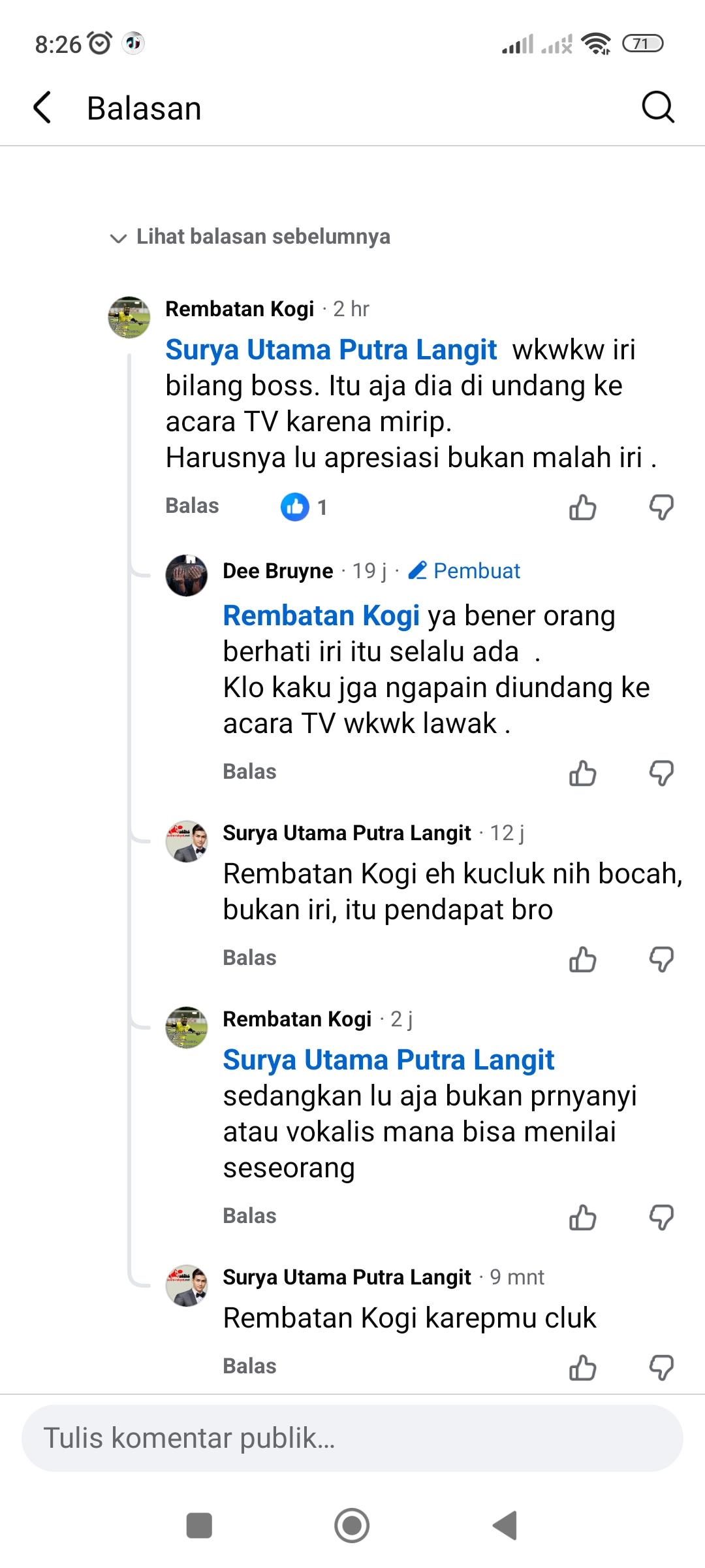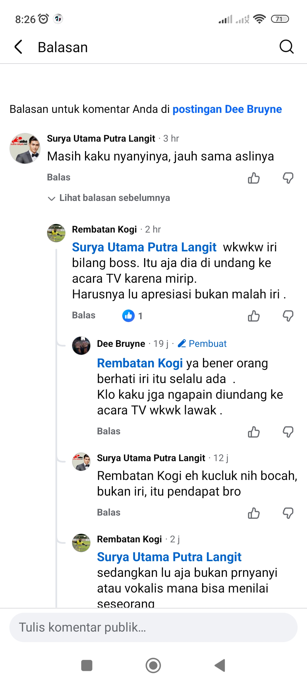 INDONESIA, REPUBLIKA| Sebuah perdebatan terjadi di kolom komentar Facebook setelah akun Surya Utama Putra Langit memberikan pendapat mengenai suara seseorang yang disebut mirip dengan salah satu vokalis ternama di Indonesia. Surya menilai suara tersebut masih kaku dan belum mampu menyamai kualitas vokalis aslinya. Pendapat itu ia sampaikan di unggahan akun Dee Bruyne.